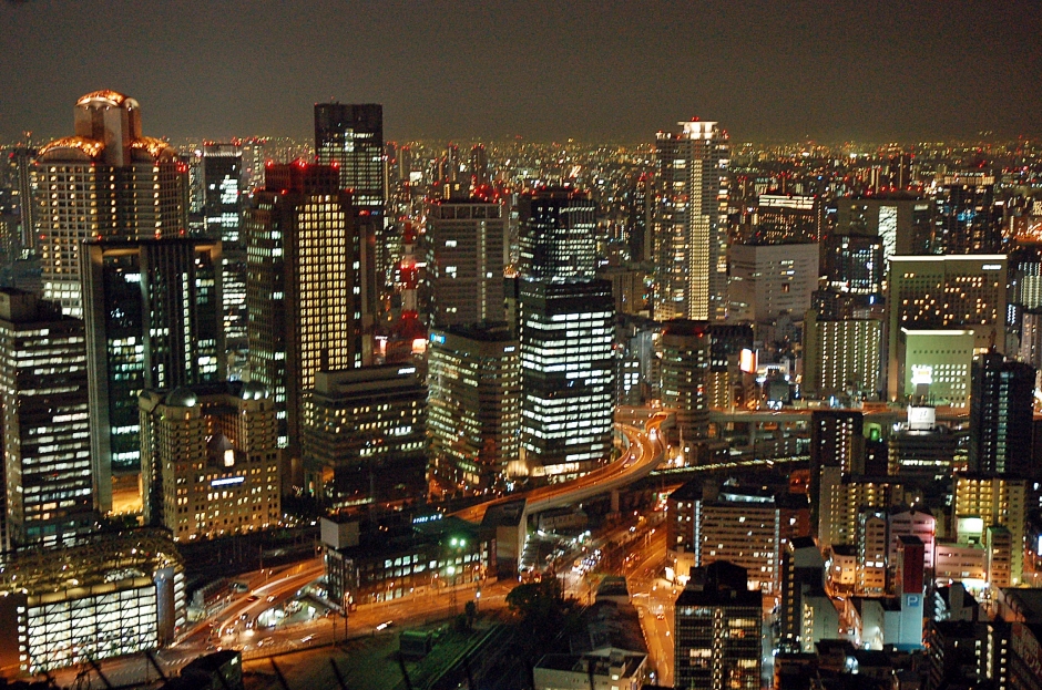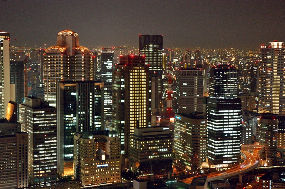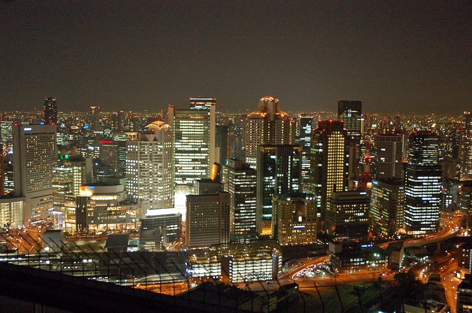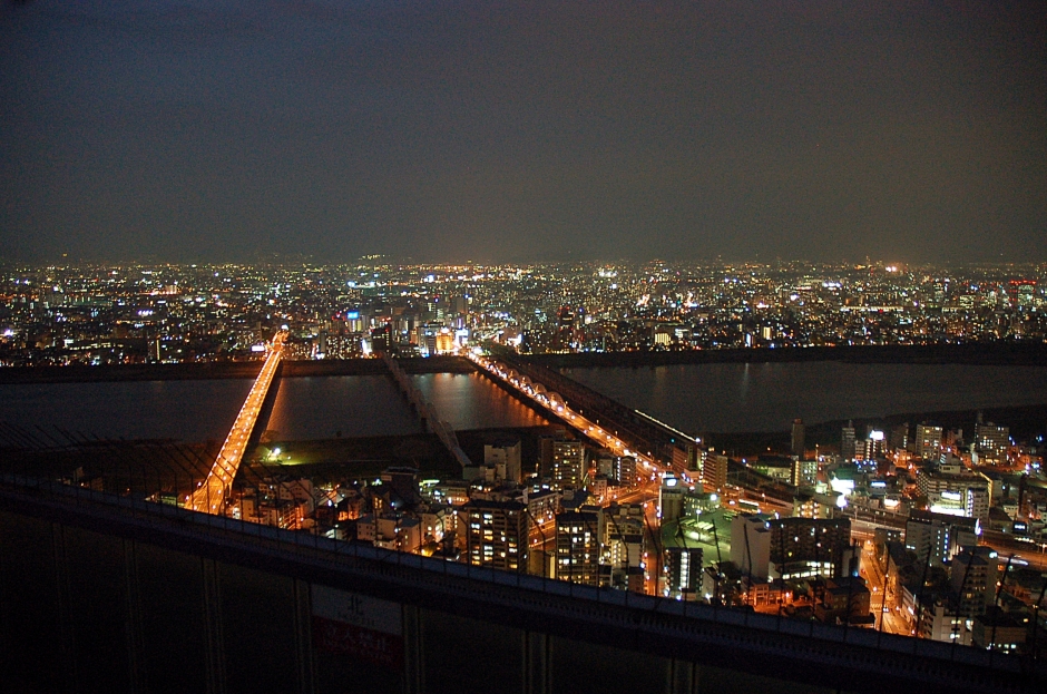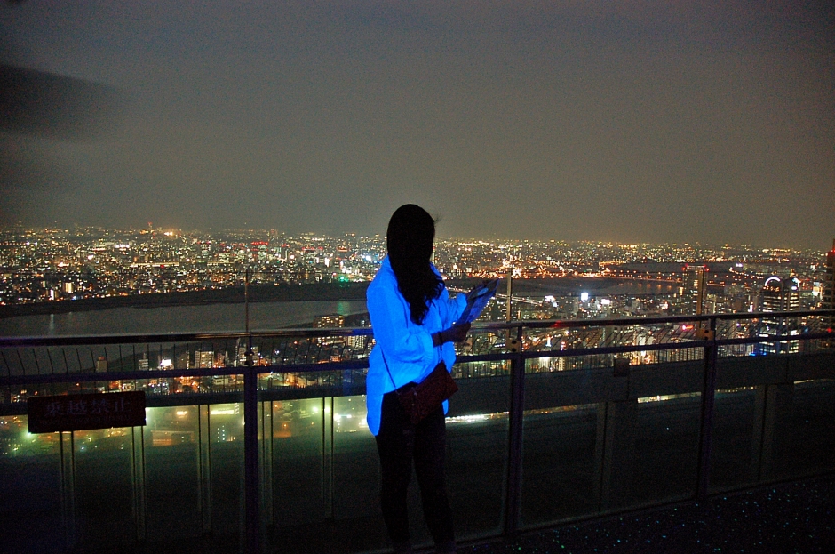 사방이 모두 유리도 둘러싸인 고속 엘리베이터를 타고... 어둠이 내려앉은 오사카의 야경을 내려다 봅니다.